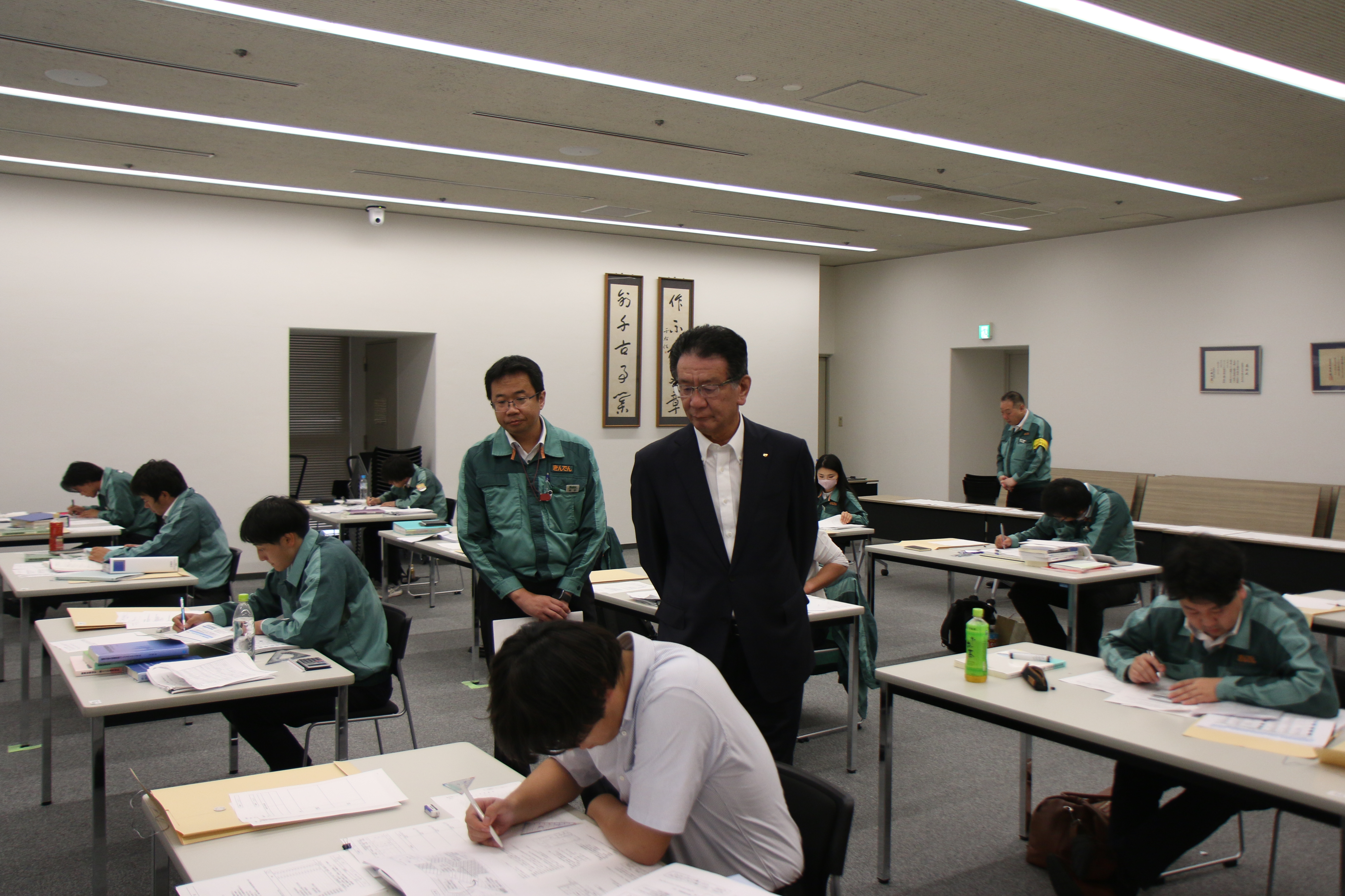 冒頭、競技会長の吉増憲二経営執行役員常務・技術本部長があいさつに立ち、 「61年の長い歴史が、社員一人ひとりの技術力を高めてきた。日頃の現場管理と同様に題意をよく理解した上で、得点配分を念頭に置き、優先順位を決めて段取り良く競技を進めてもらいたい」と述べ、 「参加者の皆さんは本日の機会を与えていただいた方々に感謝するとともに、本店(社)・支店(社)の代表として最後まで粘り強く頑張ってほしい」と呼びかけました。 競技会中には土井義宏会長、上坂隆勇社長が本店内の会場を訪れ、参加者たちの競技に取り組む真剣な姿を見守りました。 競技会は午前9時から午後5時まで行われ、近年の施設のトレンドを踏まえた課題に対し、各会場の参加者らは終了時間まで精一杯取り組みました。