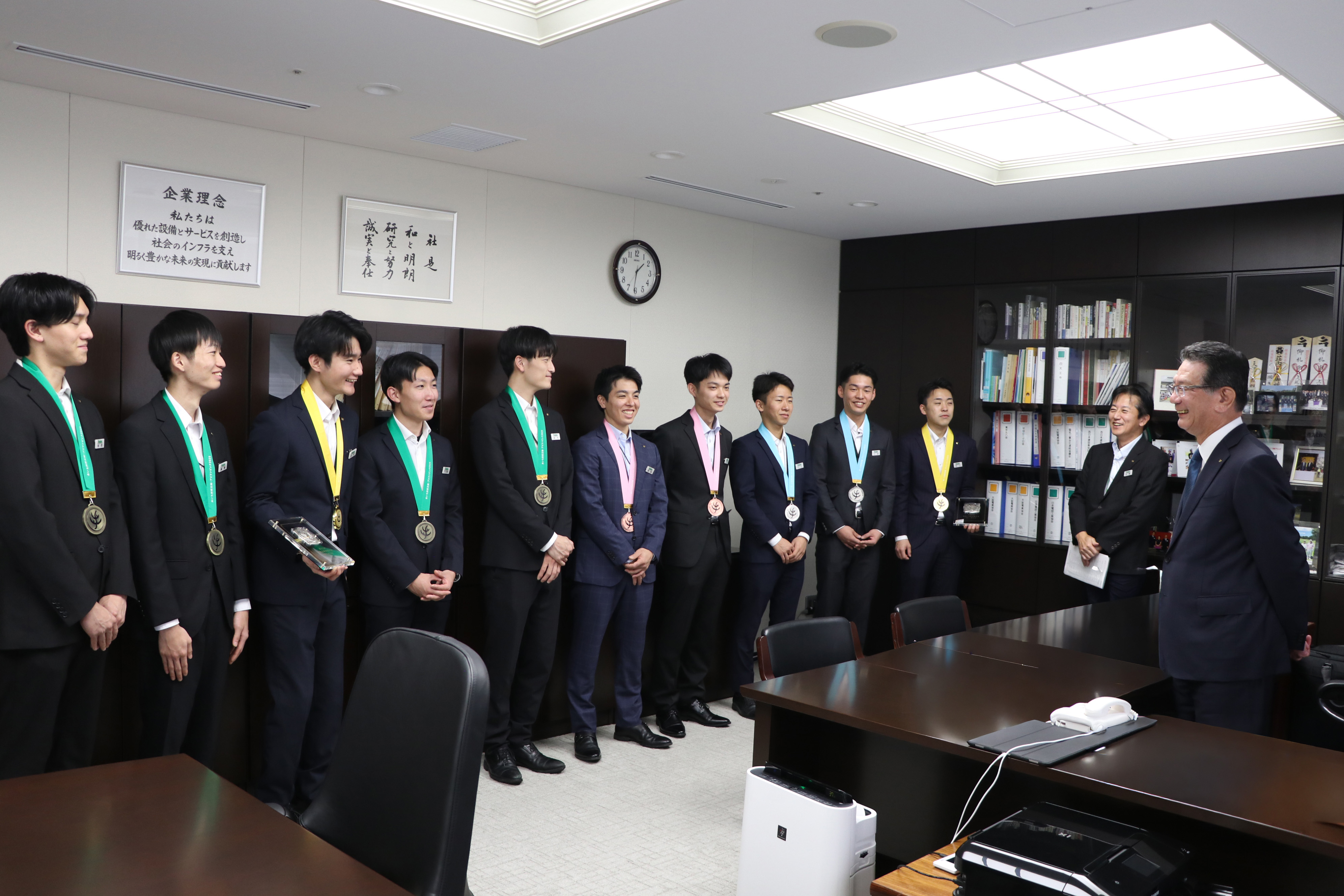 そのような中、25年10月28日に開催された取締役会において、上坂社長は全国大会に出場した当社の選手たちを表彰しました。 その席上で、上坂社長は選手たちにねぎらいの言葉を掛けるとともに、全国大会について「皆がそれぞれ持てる力を存分に発揮してもらった」とたたえつつ、今回の結果について「現在、中期経営計画で進めている人的資本への投資、人と教育に力を入れていく、心を大切にしよう、そういったことがまさに実った端的な例だと考えている」と強調。 最後に国際大会へ出場する選手に「より一層訓練に励んでほしい。引き続き『チームきんでん』として全力でサポートを行っていく」とエールを送りました。