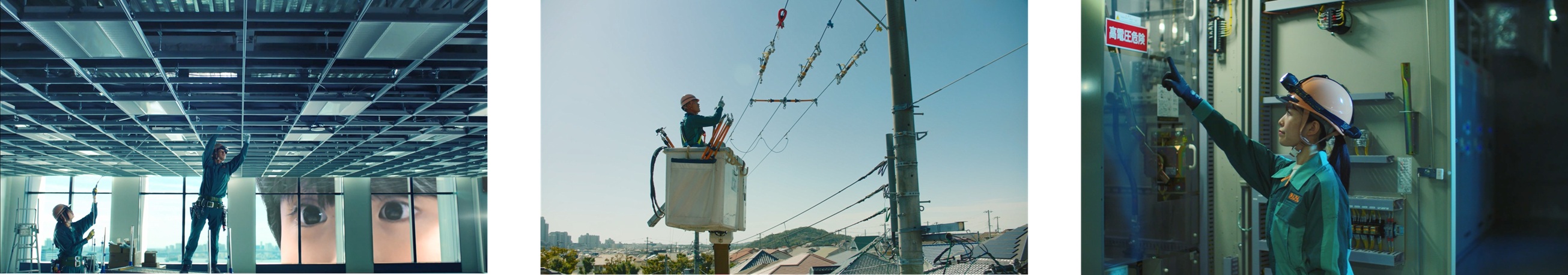 登場する技術者は全て当社の社員です。 「人財力の強化」や「未来を担う人財の育成」を早くから掲げる当社だからこそ、社員一人ひとりの姿を丁寧に映し出し、未来を支える力強い存在として表現。 社会インフラの根幹を支え、私たちの暮らしをより豊かで快適なものへと導いていることを、リアルに感じていただける内容となっています。