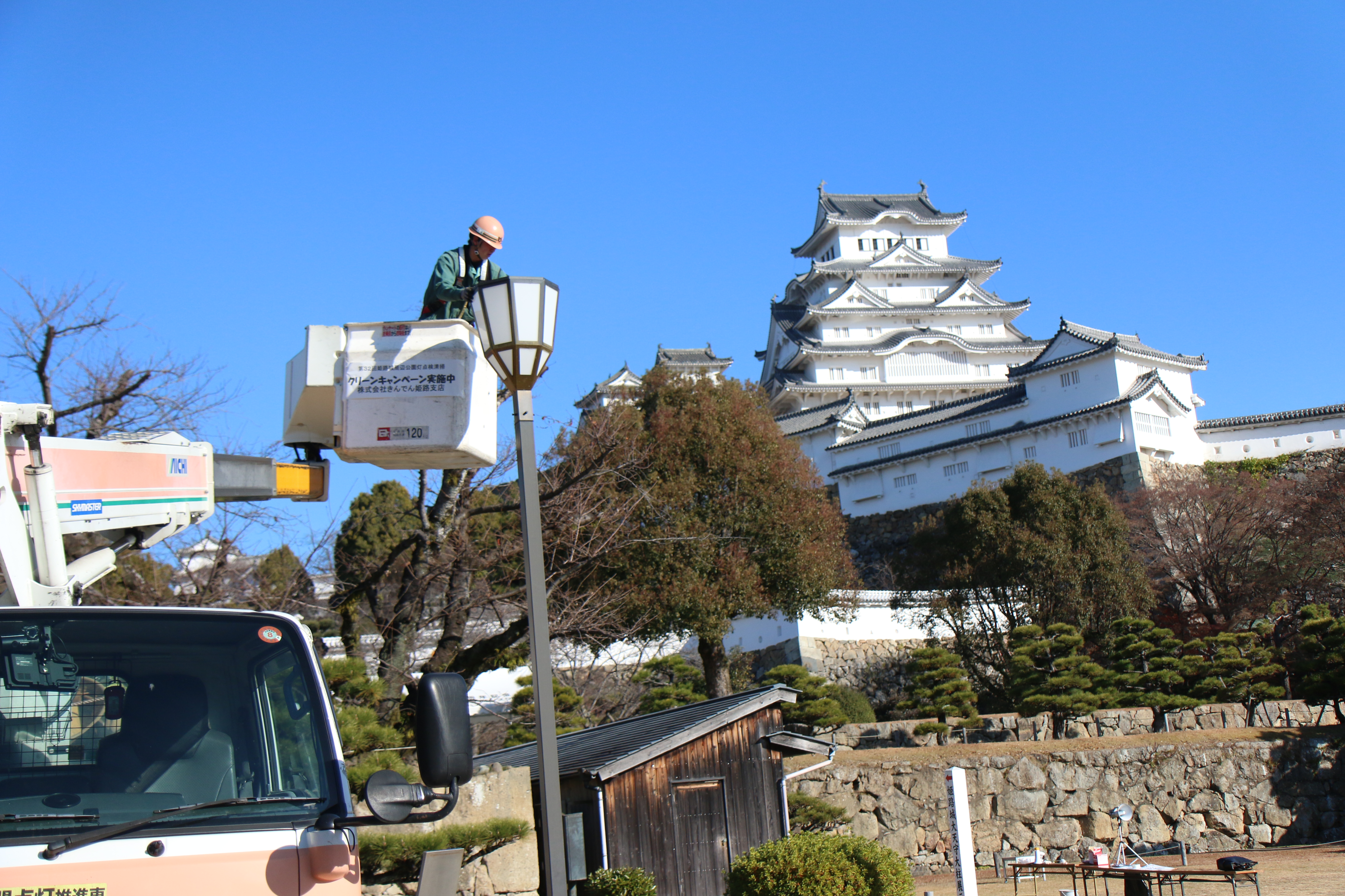 当日は穏やかな気候の下での作業となりましたが、第三者の安全確保を最優先に作業場所付近へコーン標識などを用いて作業区画を明示の上、細心の注意を払いながら、同広場を中心に高所作業車を稼動させて、約50基の電球と外装ガラスの内外を1基ずつ丁寧に磨き上げました。 また一部の参加者らは姫路城周辺のごみ拾いを実施し、約2時間で予定していた全ての作業を終了。 参加者からは「日頃より地域の皆さまにはお世話になっており、少しでもお役に立てればと思い清掃を行いました」と感想が聞かれました。